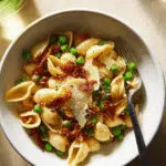 I remember the aroma of sizzling bacon wafting through her kitchen, the snap of just-blanched garden peas, and how she always chose shell pasta because it “caught the good stuff.” Years later, after culinary school and years of fine dining work, I still come back to this dish. It reminds me why I cook—not for perfection, but for joy and connection.